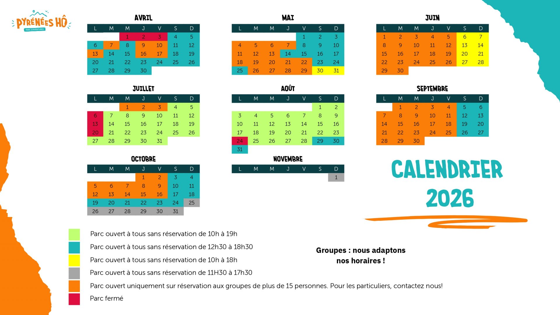 D’avril à novembre (calendrier des ouvertures à consulter juste ici), le Parc de loisirs Pyrénées Hô, accueille groupes d’amis, scolaires, centres de loisirs, CSE, groupes de sportifs, enterrement de vie de célibataires… Contactez les pour élaborer ensemble la plus belle des journées (ou des séjours !).