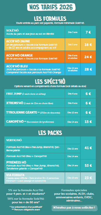 Différentes formules adaptées à tous les âges et envies vous sont proposées : Solé’Hô (jeux au sol), Accro’Hô (jeux au sol + parcours d’accrobranche) et les formules tout compris Vertig’Hô et Pyrénées Hô (jeux aux sol + parcours d’accrobranche + options incluses).