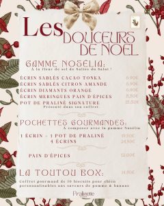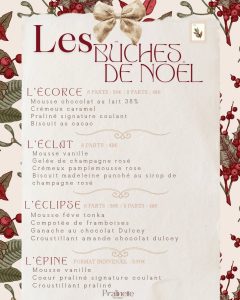 Pour les fêtes de fin d’année Pralinette vous propose des bûches, des douceurs de noël et une carte spéciale pour la Saint-Sylvestre.