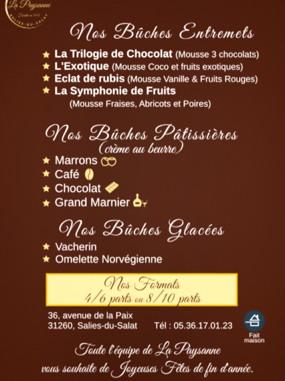 Bienvenue à la Paysanne, une pâtisserie artisanale remise au goût du jour, référence en la matière depuis 1931 à Salies-du-Salat ! Retrouvez leur bûches de Noël artisanales, incontournables des fêtes de fin d’année.